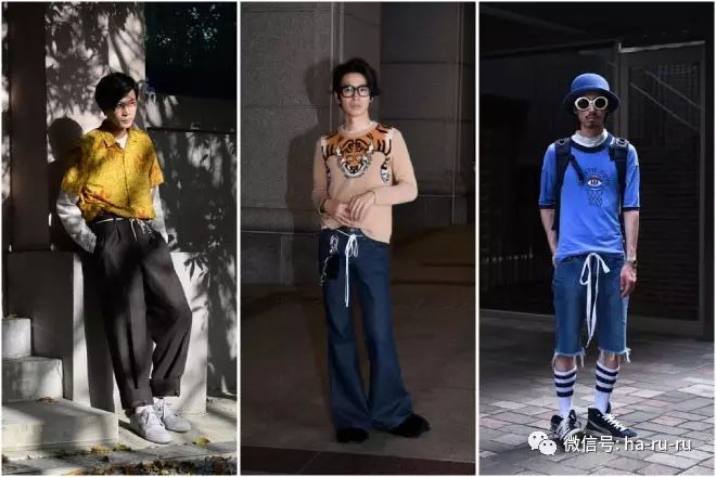 跟无洞皮带同时流行的,还有把鞋带当皮带的穿法。本来是专业滑板员为了防止因为皮带的搭扣受伤而改用的鞋带,在原宿成为了时髦的穿法。一般潮人们会用买鞋的时候附赠的备用鞋带,当然也可以在百元店里便宜地买到。