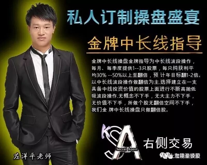 金牌中长线指导:选择建立在一支具备中线投资价值的股票上面进行不断高抛低吸波段操作,我们选的股最少翻倍的空间才下手,我们做股无空间不下手,无前景不下手,无未来不下手,无重组不下手,无概念不下手,无大主力不下手,无价值不下手,所做个股无翻倍空间不下手,我们金牌中长线操盘只做翻倍股。这种模式中间不怎么会动股,很少动适合没时间上班族守股。