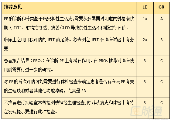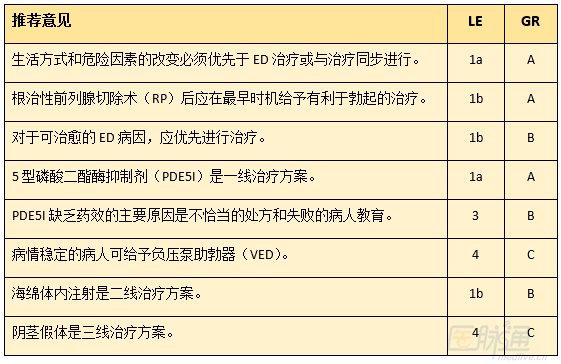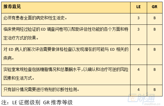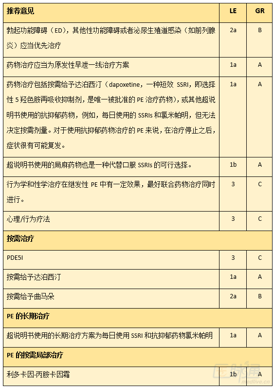 2015年的欧洲泌尿外科协会(EAU)指南对男性性功能障碍中常见的勃起功能障碍(ED)和早泄(PE)提供了关于诊断和治疗的循证意见,医脉通小编对其进行了整理,并做成了如下表格方便大家参考。详情如下: