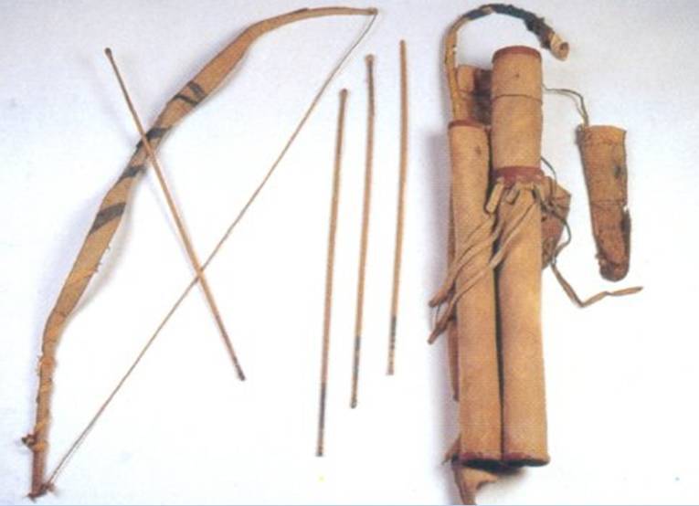 在吐鲁番洋海、苏贝希、胜金店墓地也均出土大量距今2800年前的弓箭。这些弓箭有别于战国时期的直拉弓,均为反曲弓,而且是木胎贴角片制作而成的角弓,具有斯基泰弓风格。
