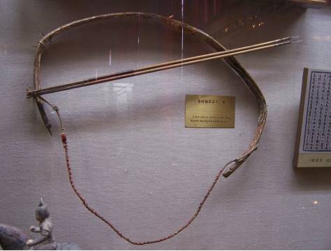 可见,反曲弓是从西域传入中原。到了汉代,中国就普遍的都是反曲弓的形制了。由于汉代本土地区大体气候湿润,弓实物出土较少。在西域之外的其他地方,几乎没有出土过汉代角弓的实物,马王堆三号墓也只曾出土过单体直拉木弓与箭矢。