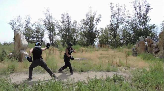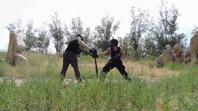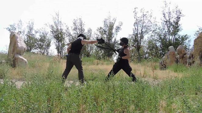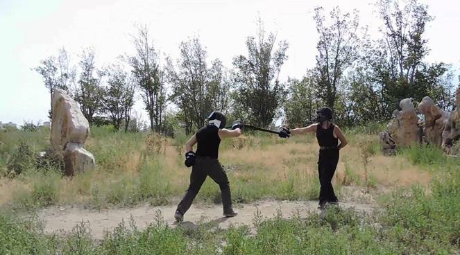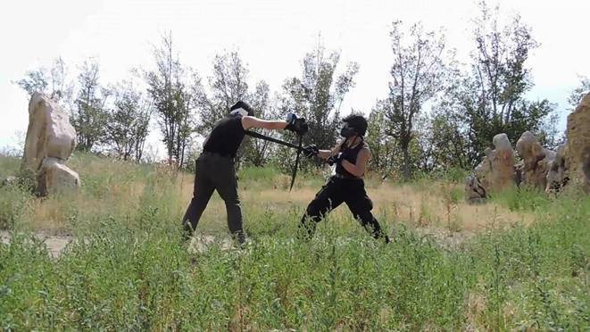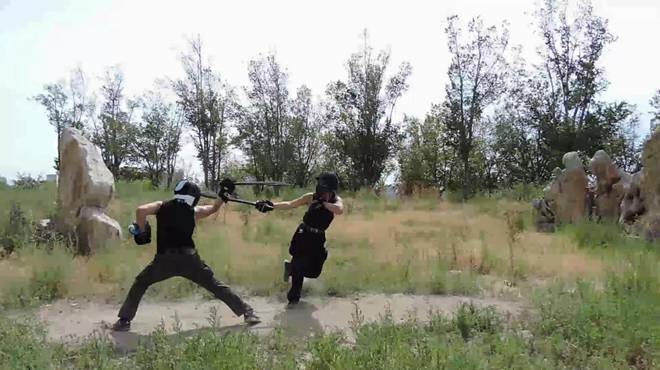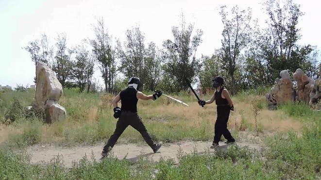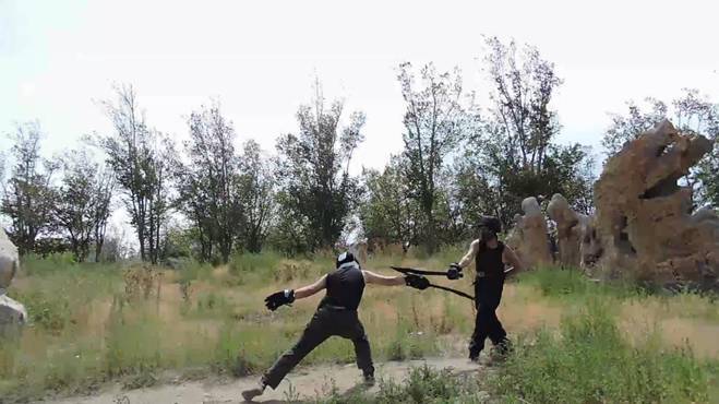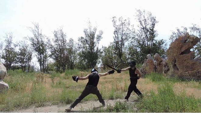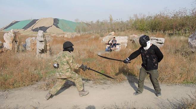 虽然刀的形制并不相同,但是传统牛尾刀也一样可以用出西方马刀的招式,这一局我俩就尝试使用马刀技法来进行对抗。这次我就右腿在前的起手式,使用侧滑步来进行攻击。不过毕竟我不是专门练马刀的,站姿依然带着传统武术的风格。