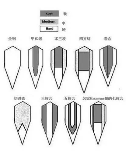 ▲日本刀各种复合钢煅造剖面,剖面大多是外硬内软