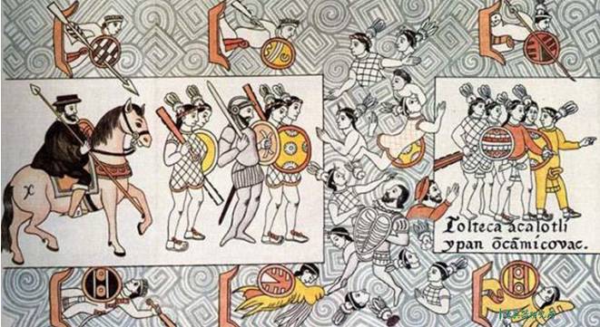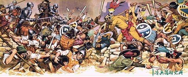 ▲阿兹特克人对抗渡河作战的西班牙人,里面对阿兹特克人的盔甲有形象描绘