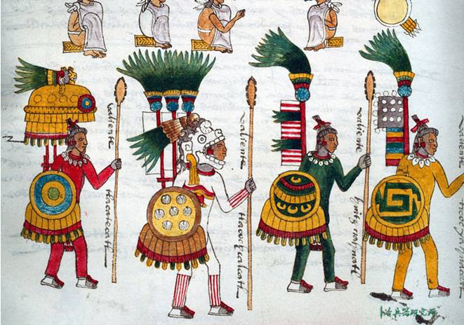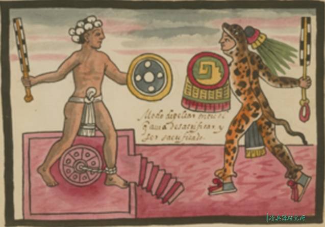 这副图显示了阿兹特克人献祭的场面,披挂美洲虎皮战衣的精锐战士使用重型Cuauhchimalli盾牌,几乎赤身而脚被绑住的牺牲者使用轻型Otlachimalli。两者使用马夸威特进行决斗以献祭天神,大多数情况下以牺牲者的毙命收场。