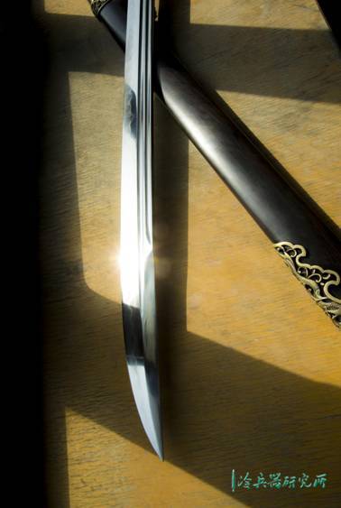 关于长刀在战斗中的震动问题,古人不仅仅在柄部进行减震。上图可见,从刀背上看,刀身厚度并不是一样的,而是从刀根部到刀尖处逐渐变薄,这种处理可以让武器碰撞时刀柄处的震动变得更小。在日常生活中,拿个钢条做实验也可以发现,厚度一致的钢条碰撞时两端震动最大,如果厚度并不一致,那么更薄的部分震动大,而厚的部分震动幅度要小很多。同时这样处理刀身厚度,还可以起到调整重心的作用,一举多得。因为杠杆原理,重心离手越远挥舞时就越吃力,但是重心过于靠后挥砍又比较无力,所以武器对重心都有要求。这把仿明代腰刀的重心在护手前18cm处,挥舞感觉还算顺手。很多现代刀剑都是成品钢板线切割成型,厚度都是一致的,这样的刀剑就难以进行实战了。钢板直接切割刀剑,在武器碰撞时震动会很大,而且重心也过于靠前,挥舞时手腕负荷会很大。有些也有配重,但是整体重量就上去了,因为重心想调整到合适的位置配重就要加大很多重量,这样在挥舞时体力耗费就更大。