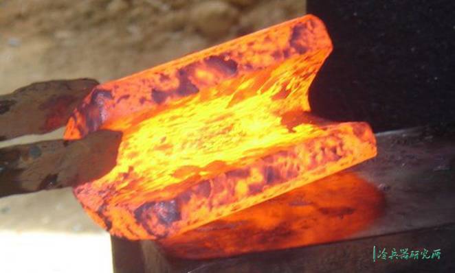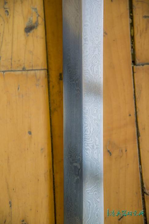 这把剑的刃材,与历史上的实物可能有所不同,是折叠锻打花纹钢。欧洲人说的"大马士革钢"、俄国人说的"布拉特钢",以及古时由波斯、罽宾(今克什米尔)传入中国的镔铁都属于花纹钢。最早的花纹钢是由于冶铁工艺水平较低,导致冶炼出来的金属钢制不匀,需要反复折叠锻打排除杂质,钢质因为不匀折叠锻打后会形成花纹。但是随着冶铁技术的发展,冶炼出来的钢质也愈来愈好,需要反复锻打来形成的花纹也比较不明显了。但用作刀剑的钢铁,有两个基本属性,一是硬度,一是韧度,硬度就是这把刀能够切割多硬的东西,韧性是材料受多大能量冲击而不断裂的能力。可是这两种属性在一定程度上是互反的,钢铁里面含碳量越高,硬度就越高,打造出来的刀越锐利,但是也越脆,很可能一碰到硬的东西就崩口了;而含碳量低的熟铁,韧度很高,打造出来的刀不容易崩坏,甚至可以弯曲到一个程度也不会折断,但是没什么硬度,切割不了比较硬的东西。如何让刀剑兼顾任性和硬度,一直是刀剑匠人们不断追求的终极问题。