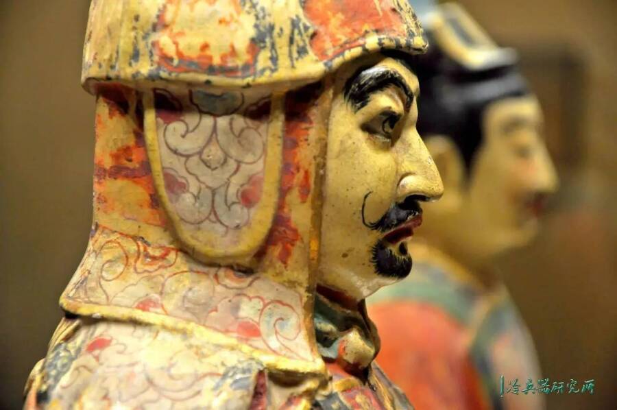 ▲郑仁泰墓唐三彩武士俑,所佩戴的盔型是唐盔的代表样式之一