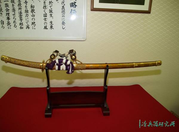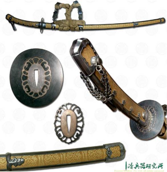足金物:太刀刀鞘上有两个金属环(靠近鞘口的一个称“一足”,另一个称“二足”)用索带相互穿插编织成型,使之便于携带。