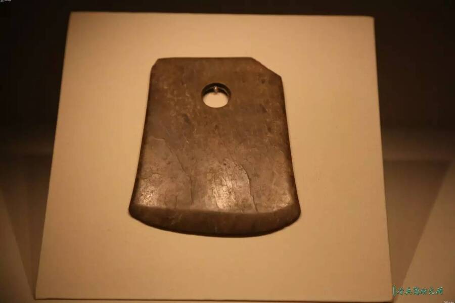如余杭良渚文化遗址的11座墓中,有9座出土了石钺,这些钺通长70~80cm,柄部涂有朱砂,并镶嵌玉粒,末端有柄首。