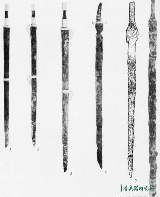 (3)短兵:根据阿尔泰突厥墓葬品及蒙古和南西伯利亚突厥石人像的佩饰,可把马刀、匕首和剑归人这一类。马刀柄直,有十字形的腊(也有弯柄无腊的),刀身厚重。匕首也是直柄,惟刀锋有楔。剑制作甚精,剑身楼刻图案。