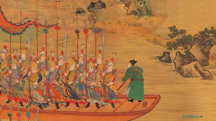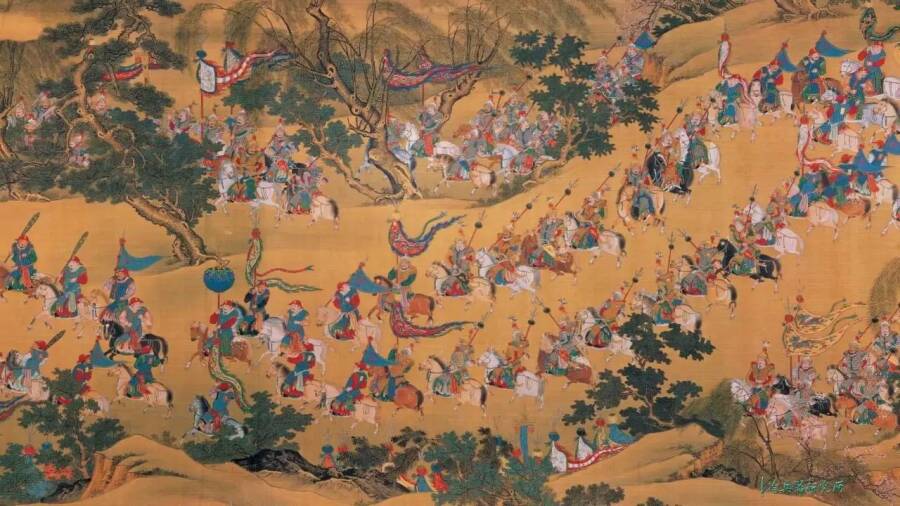▲《出警入跸图》局部之一,可以看到该画面上有三人皆穿“山文甲”