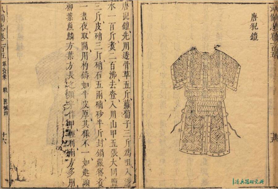▲《武备志》中抄袭自明代兵书《兵录》的唐猊铠图。从图像上看该甲甲片就是山文款式。但此甲的制作方法极为诡异,书中写道:“先用透骨草五斤,萝葡子三斤为咀,入清水一百斤,煮二百沸,去查,入川山甲五张,大同盐三斤,皮硝三斤,硝石五两,硵砂半斤,封锅严密,煮一昼夜。取开,用杓铸如牛皮厚,其样不一,如匙头、柳叶、鱼鳞、方叶、方长之类,穿做甲。轻利,南方多用。”最末一句里的匙头、柳叶、鱼鳞都是在《明会典》里提到过的铠甲佳叶类型;方叶、方长暂不知为何状。全文中再一次地还是与“山文”无一字相联系