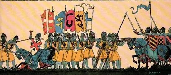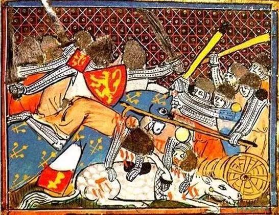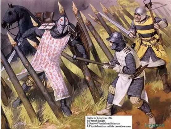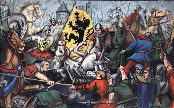 ▲金马刺战役中作战的佛兰芒平民刺槌兵和法国贵族骑士