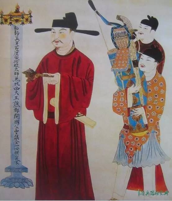 ▲还有一种推测,就是说唐朝吴钩是一种直剑,这个就更加离谱,纵然是直剑,也要有让人联想“钩”的部位,图中侍从所捧武器中一件弯把直刀,如果直刀说有点靠边,也可能是这样的