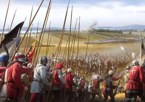 在福尔柯克战役中,“长腿”爱德华正是用长弓击败了华莱士。苏格兰独立后,在杜普林山、哈利敦西尔等战役中,英格兰同样依靠长弓多次打败苏格兰枪阵。一些论者以瑞士人三次击败勃艮第公爵鲁莽查理为例,试图说明只要有“近代军队的组织”,长枪方阵可以无视于远程武器。但问题是鲁莽查理那支所谓的“合成军队”无论士气、编制、组织还是军令都有很大问题,虽然看上去阵容堂堂,实际上缺乏打硬仗的能力。用骑兵迫使长枪手摆出全向防御阵,再用远程武器予以杀伤,几乎成为破长枪方阵的一种定势。