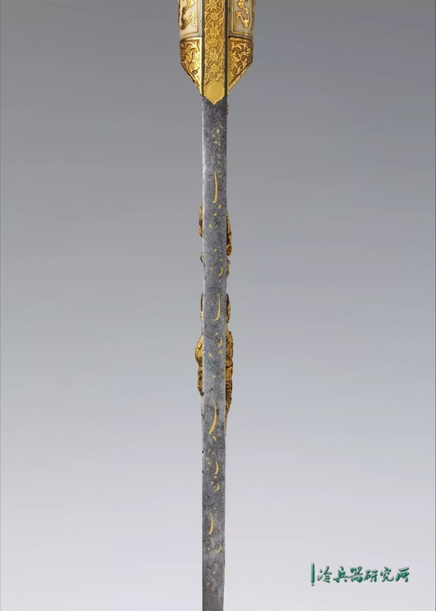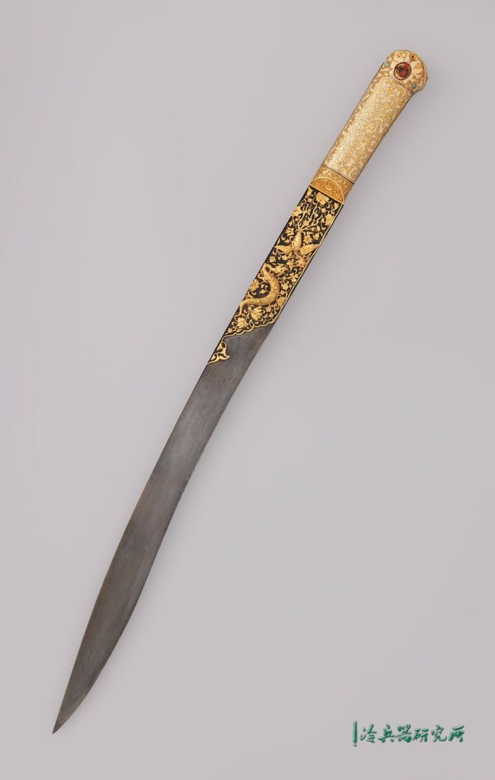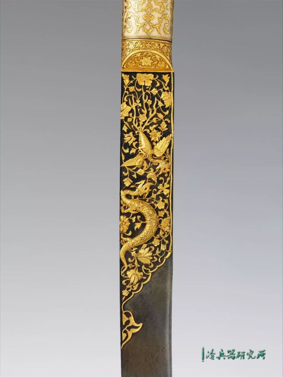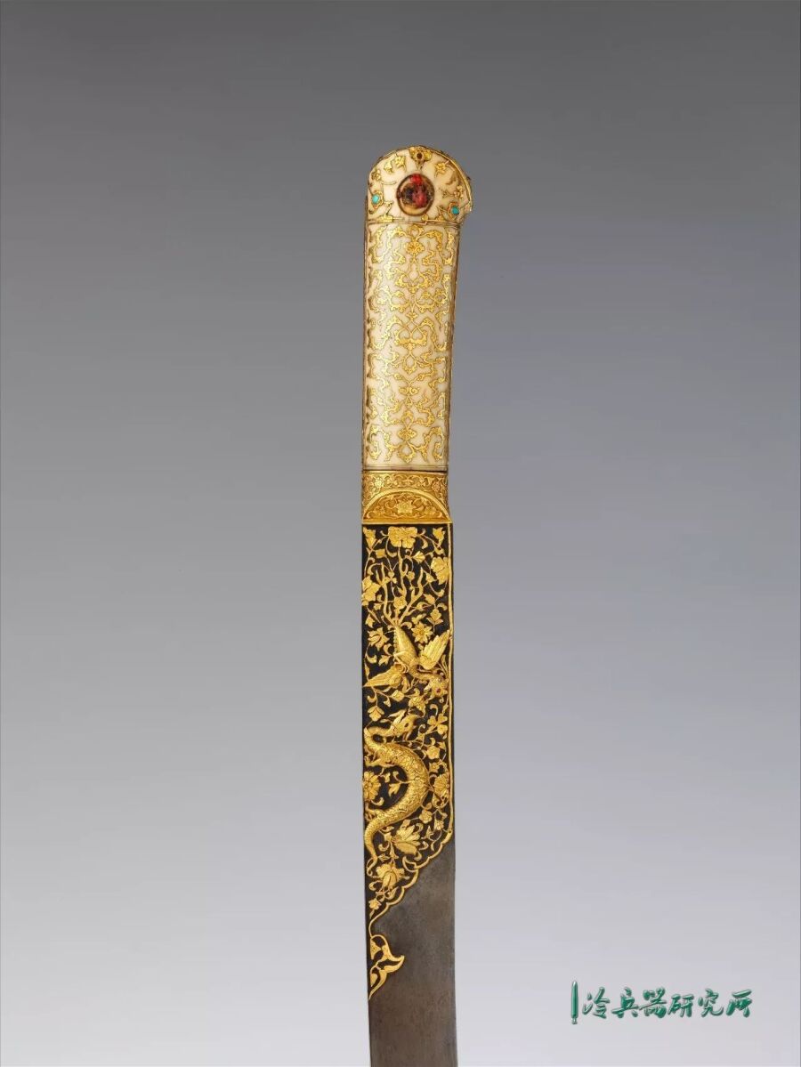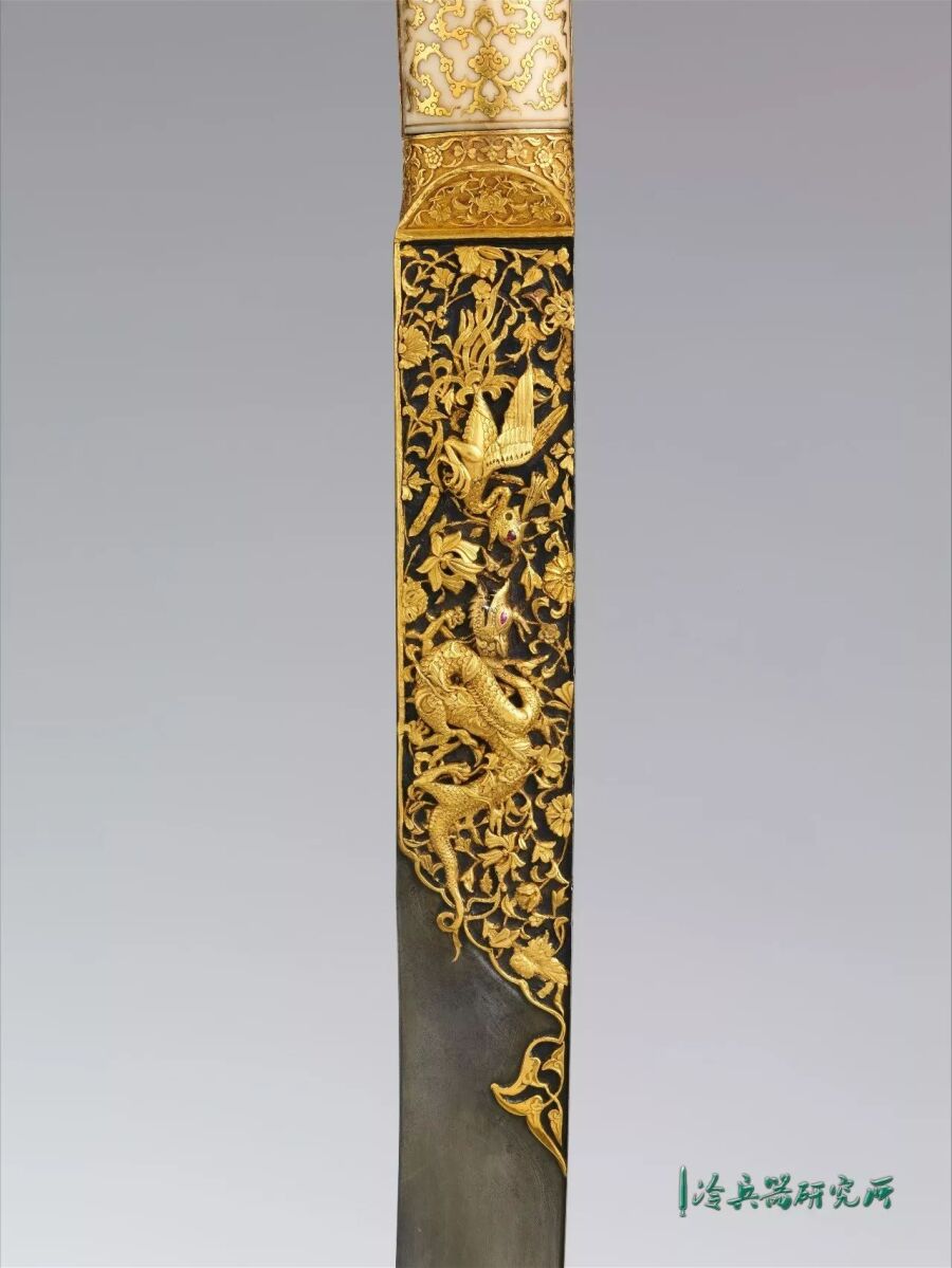剑身主体为钢质,剑刃上半部分是以镶金卷草纹为底,之上为相对的龙与凤。象牙剑柄上是镶金卷云纹以及卷草纹,这些源自中国的元素,大概是在与波斯的接触中传入奥斯曼帝国的。