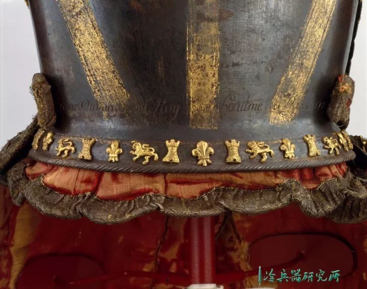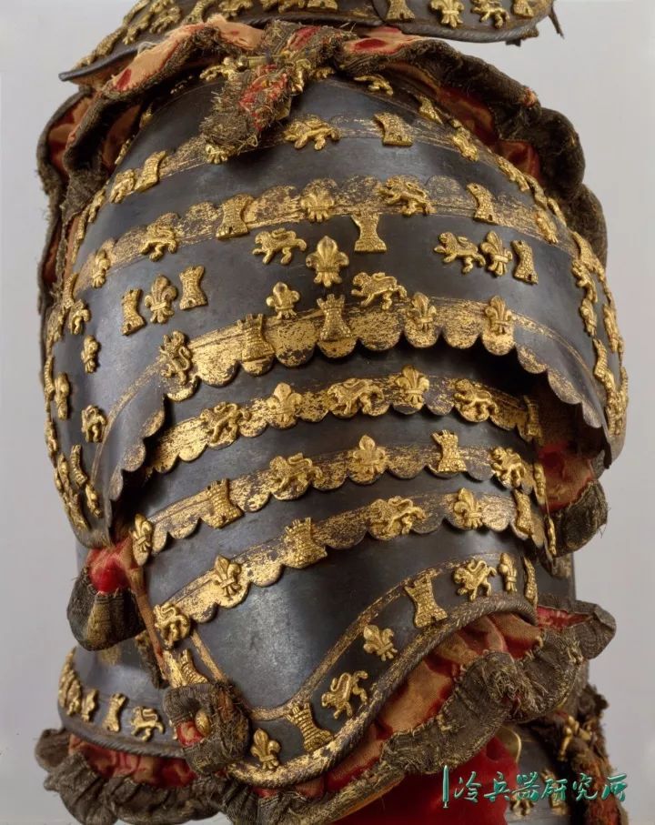 十八世纪,盔甲时代已然进入晚期。而作为相当罕见的为儿童所作的盔甲,它保存至今的状态极为完好,红色天鹅绒绸缎衬里色泽鲜艳,而盔甲表面仍然闪烁着蓝金色的光辉。镀金铆钉是里昂雄狮的纹章样式,卡斯蒂里城堡,还有法兰西鸢尾花的装饰,显示着路易作为西班牙王位继承人的身份,还有他同法兰西紧密联系的高贵出身。