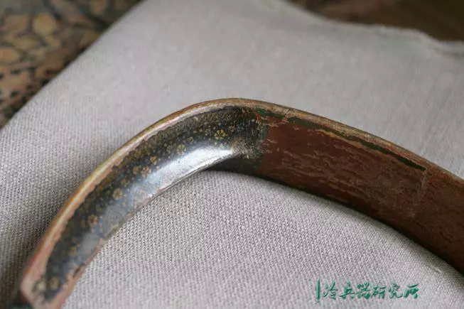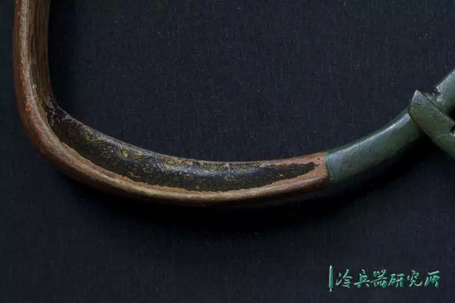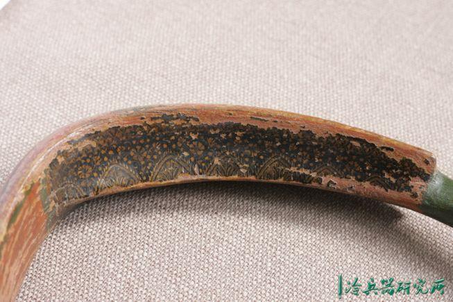 由于印度天气潮湿,典型的莫卧儿弓的弓面通常以漆覆盖做保护,下图所示的弓表面大部分是红色的,弓梢则是绿色的,而弓腹的平坦表面则以漂亮的绿漆纹做衬里。因年代久远,外漆稍有脱落,而最大的磨损则是在弓面,这表明使用程度很高。手柄和双耳的内部都是用黑色漆成的,带有精致的花朵纹饰,混有金色小碎花。除却过度弯折和虫蚀,一般来讲,螃蟹弓寿命都是蛮长的。