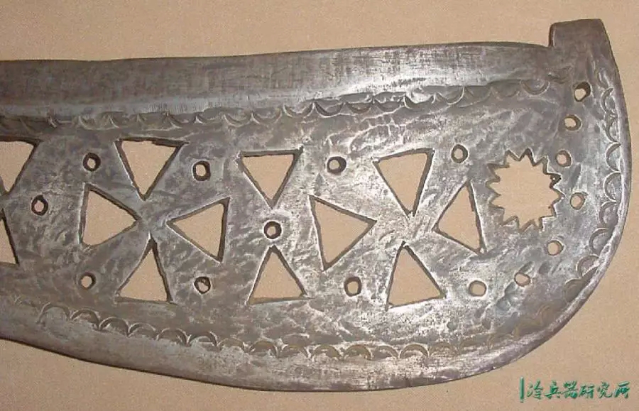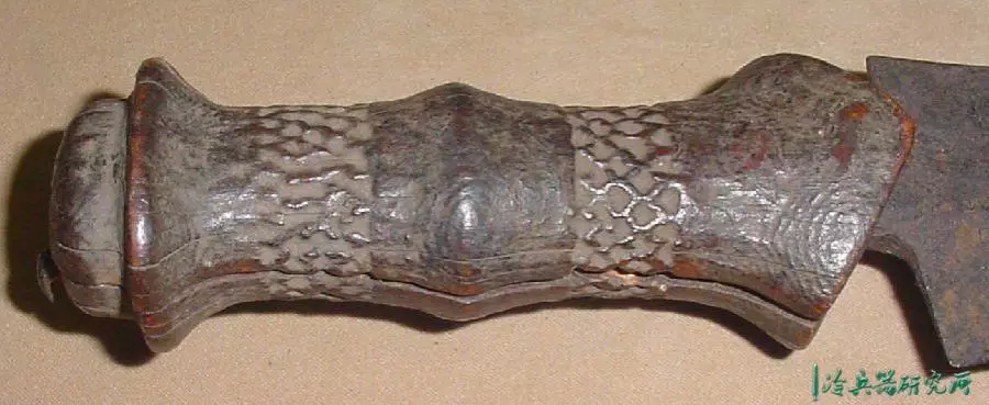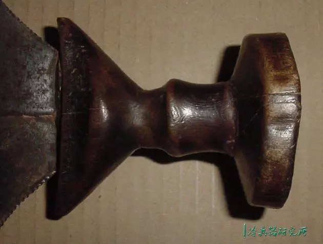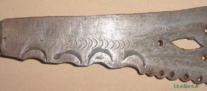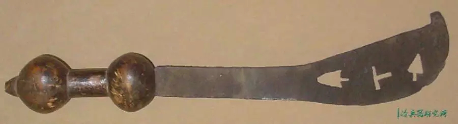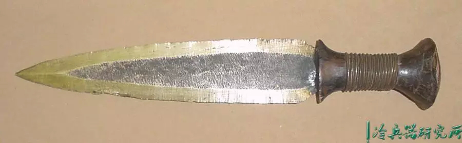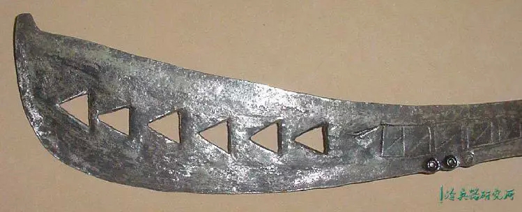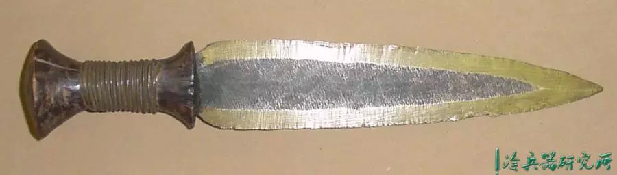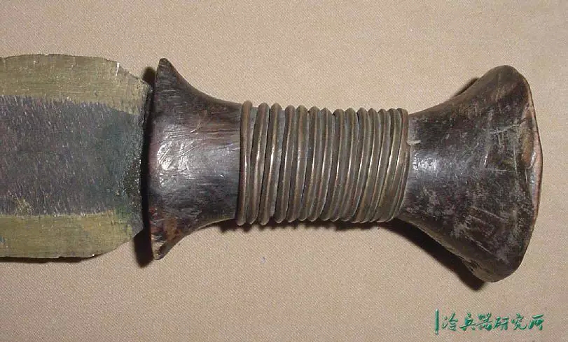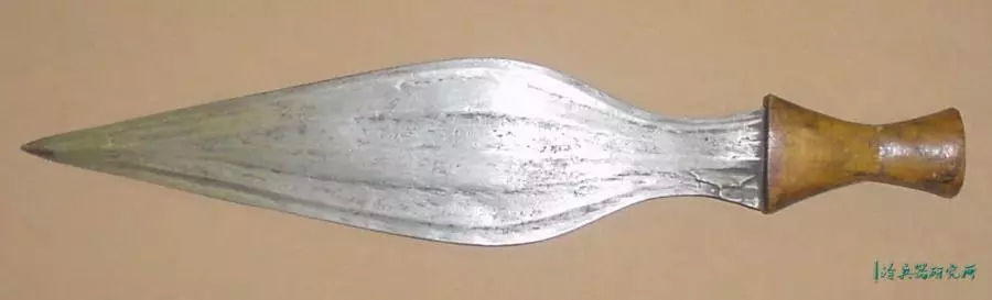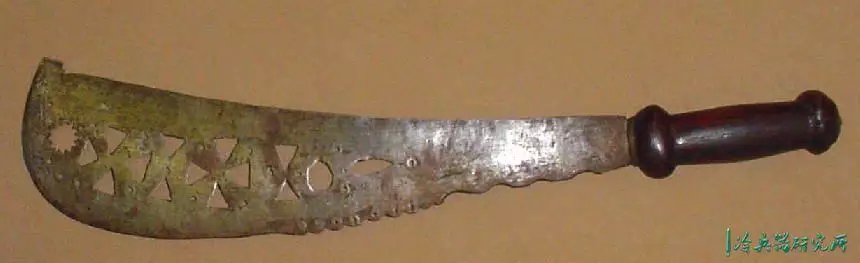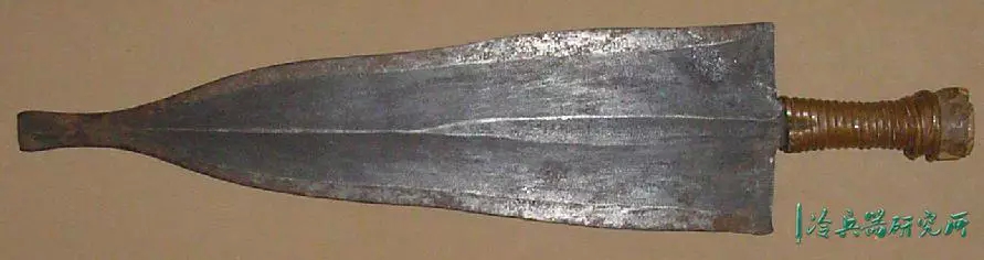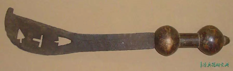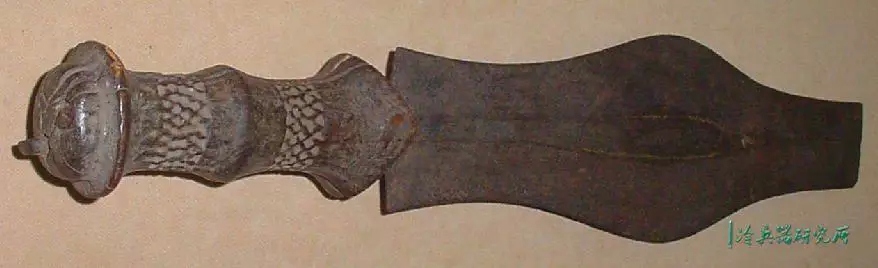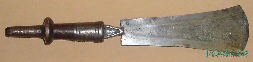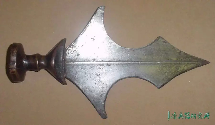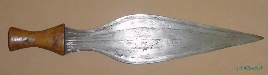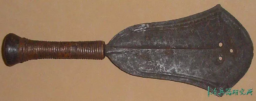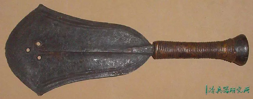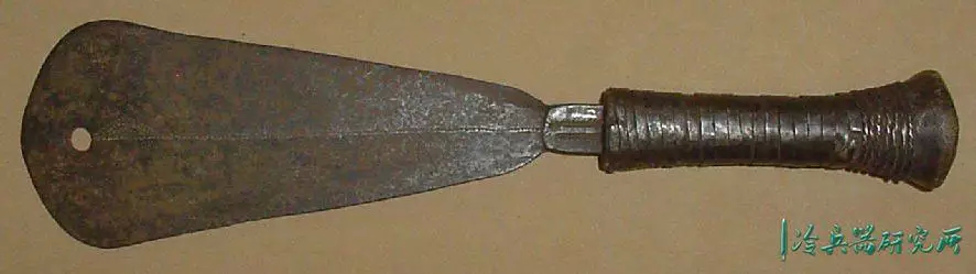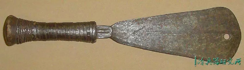 宽刃,锋利的弯曲边缘,向圆形尖端扩展,具有独特的不对称中心脊,穿有3个孔,是一种高效的短砍工具。