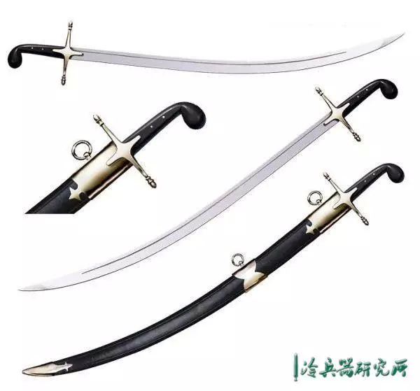 下面这把刀不仔细看也是带血槽的奥斯曼舍施儿弯刀,实际这刀刀头部位稍微加宽,开有反刃,是属于奥斯曼基利弯刀。因此也有人不认为这款复刻品是舍施儿弯刀,而应该是基利弯刀,本文以舍施儿弯刀为准。