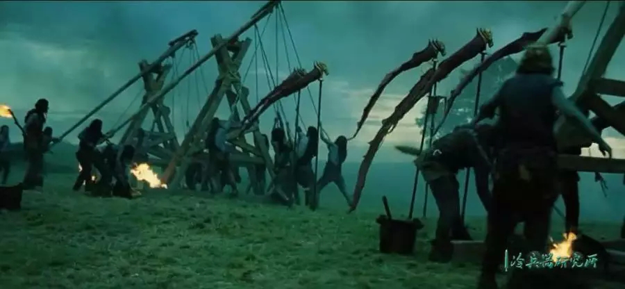 这是电影中梅林指挥的人力投石机,这种投石机虽然在人类战争史上被使用了相当长的岁月,但是在影视作品中却是极少出现。当然,惊讶归惊讶,投石机首次出现在英格兰的战场是在13世纪,更别说是这个时代落后的皮克特人,更不可能会拥有这样的黑科技。