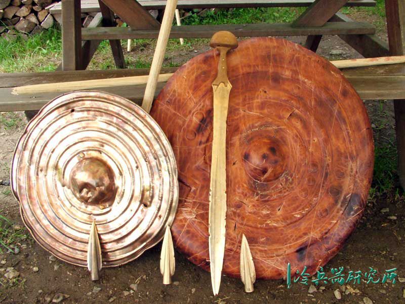 与铜盾相比,皮盾的制造相对比较容易,因此皮盾可能是青铜器时代的常见防具。通过留存的矛头和剑的数量来判断,盾牌制造在那时就一定已经受到广泛传播。