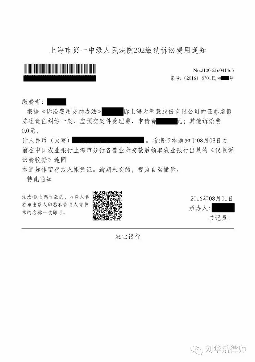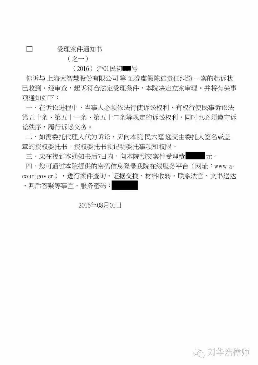今天收到上海市第一中级人民法院通过邮件送达的受理通知书及缴费通知书,至此,刘华浩律师证券索赔团队代理的大智慧索赔案正式获得法院受理立案,拉开了股民通过诉讼维权的序幕。