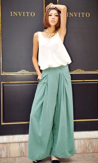 白色宽松背心,水绿色阔腿裤,非常清凉简洁的配色,显得腿部格外修长。加上金色体积感的饰品,时尚(微博)感倍增。2012流行发型(www.faxingzhan.com)