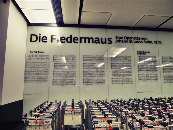 摆放供旅客们租借行李车的地方的背景墙是整面的乐谱,来自小约翰,施特劳斯的歌剧《蝙蝠》选段《踢踏波尔卡》。从机场出来在火车站等前往租住公寓的火车时,另一轨道上的火车启动准备出发,令我惊讶的是,火车启动的汽笛不是“呜⋯⋯”的一声,而是一个八度的音阶。于是从机场开始,开始了我的维也纳艺术之旅。