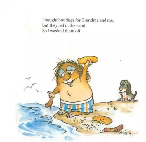 玩了很久我累了,我为自己和奶奶买了热狗。但是不幸的是,热狗掉到沙滩上了,于是我简启明它们,在海水里洗了洗。