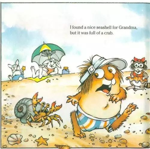 我想为奶奶捡一只最大最好的海螺,但是,我捡到的那只里面居然藏了一只螃蟹,吓得我急忙丢下海螺逃跑了。
