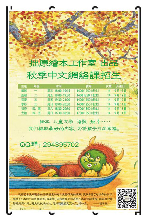 十分抱歉,由于我们的失误,原招生海报上的“枫叶班”(新学期一年级)的时间出现错误,枫叶课的上课时间为6:00-7:15,共计75分钟,并非6:30-7:15。由此给您带来的不便,我们再次深表歉意。