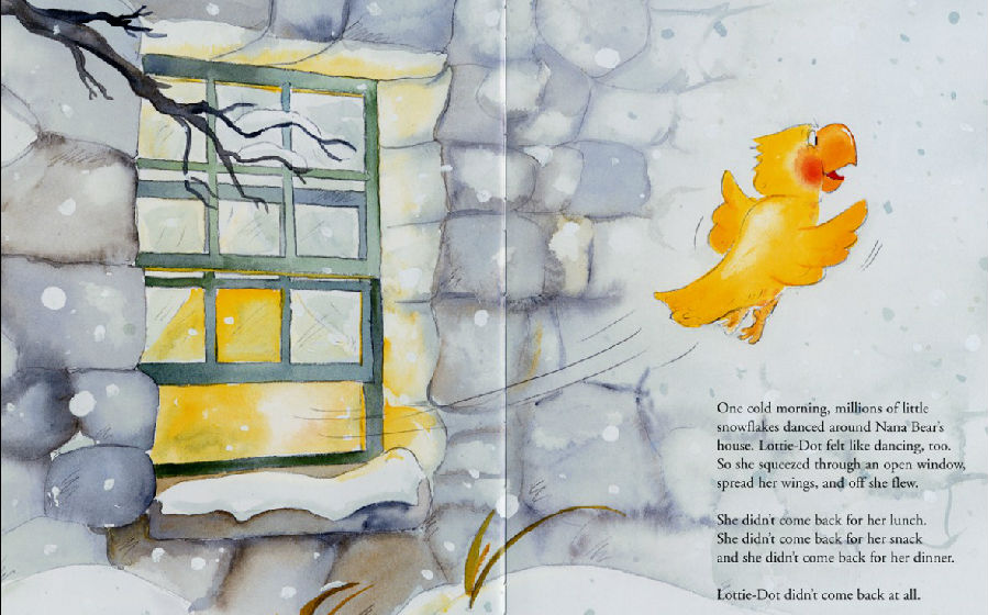 一天很冷的早晨,无数的雪花在窗外飞舞着,好像一个个轻盈的舞者。洛蒂点点也想要跳舞,于是她从一闪开着的窗户挤了出去,拍打着翅膀飞走了。