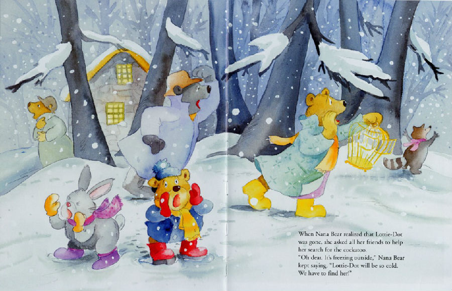 当娜娜熊发现洛蒂点点不见了的时候,她请所有的朋友帮忙一起找洛蒂。“哦,天哪!外面冷极了,”娜娜熊说“洛蒂点点一定很冷吧。我们一定要找到她。”