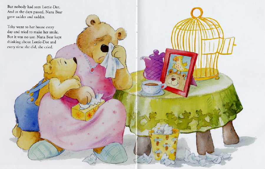 但是大家谁都没见到过洛蒂点点。日子一天天的过去了,娜娜熊也是越来越伤心了。托比每天都去娜娜熊家安慰她,只想逗她开心,让她重新笑起来。但是这没用。娜娜熊还是会想洛蒂点点,而且每次她想到洛蒂,就会掉眼泪。