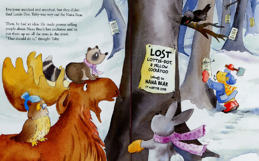 忽然,他想到了一个好主意。招贴海报,让大家都知道娜娜熊丢了洛蒂点点,这样就好找了。把大街上的每一棵树上都贴上,这样就万无一失了。