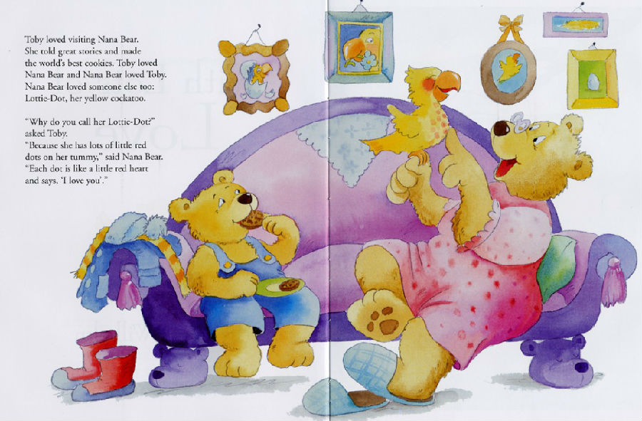 托比喜欢到娜娜熊家里玩。娜娜熊不仅会讲很多有趣的故事,她做的饼干是世界上最好吃的饼干。托比爱娜娜熊,娜娜熊也爱托比。不过,娜娜熊还爱另外一个人---洛蒂点点:她那只可爱的黄色小鹦鹉。