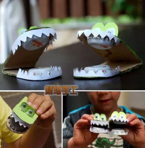今天教大家做一个废物利用小玩具——长着尖尖牙齿的大鳄鱼,闭嘴时还发出咔嚓咔嚓的响声,好怕怕!