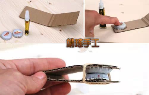 非常简单的小制作,只需要一点硬纸板和两个啤酒瓶瓶盖就可以了。