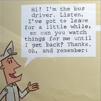 司机:嗨!你好啊!我是一名公共汽车的司机,我现在有点事情要离开一小会儿,在我回来之前,我能拜托你帮我看管好我的汽车吗?哦,好的,非常感谢,请你一定要记得不要让那只鸽子开我的车哦!