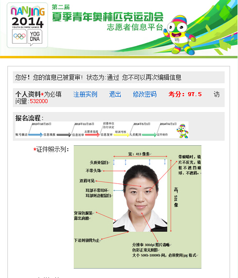 报名和录取绝对是两码事,但是它们有个共同的特点就是严格。报名需要自己在网上注册,填写详细的个人信息,尤其是照片,组委会对照片的审核十分严格,要求穿着深色服装,头发不得遮挡脸部,我清楚的记得自己为了让照片合格,去宿舍楼下的照相馆拍了一共六次。南师大报名青奥会志愿者的共计4000人左右,但是只有不到900个的名额,于是面试也成了一个挑战,只有大约五分之一的录取率。期盼已久的志愿服务机会,我当然不能这样轻易就被别人击败,于是在学习之余我准备了无数个版本的自我介绍,同时也在网上搜集关于青奥会的各种知识,终于皇天不负有心人,在两轮寒冷面试之后我正式成为一名南京青奥会的文教类志愿者了。