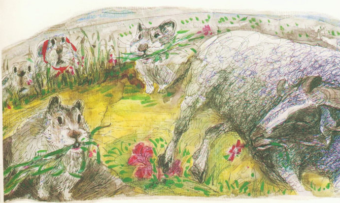 终于,一只长着弯曲的大角的绵羊抬起头来,边咀嚼着满嘴鲜美的草,边慢吞吞地说:“这里是我们的草场,我们想吃啥就吃啥,想在哪吃就在哪吃!”。