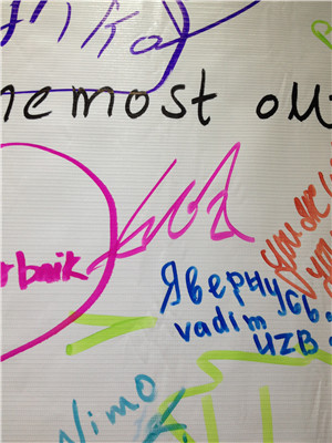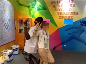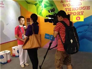 和我一起工作的小伙伴中,有一位来自于天津日语专业的小哥:Frank,他由于语言优势被选为文化教育代表参加青奥会服务。他的主要任务是带日本代表团到村外文化教育场所参加活动,一次在跟日本代表团出行的路上,和一群一同乘车的瑞典女足妹子相识,Frank热心的讲解和幽默的谈吐使得瑞典妹子和他在短短的一下午时间结下了深厚友谊。在比赛之余,瑞典妹子来我们IOC展台学习玩耍,在签名环节,队长站在高高的凳子上喊着Frank的名字,下面的队员们也积极配合,欢笑声招来了一旁的央视记者,记者好奇的询问了瑞典妹子们并且采访了她们,当然在她们离开后,有采访了我们Frank小哥。这是我出现了,作为背景墙成功在央视露脸,但是可惜的是作为背景的我很模糊,而且更重要的是,我们Frank小哥被采访的新闻也只是剪辑播出了十几秒,这可是足足采访了近半个小时啊,心里觉得有些坑人啊!