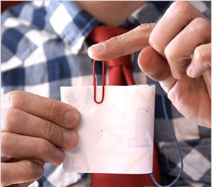 5) 注意要慢一点,让回形针在纸上向后滑动,不要掉下来。