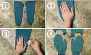步骤一:按自己手的大小剪裁出手套的样子,注意适当大一点,因为缝合的时候会占用一部分空间,同时,大一点暖和!