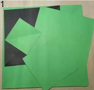材料:大小不一的正方形绿色彩纸若干张,黑色彩纸一张。