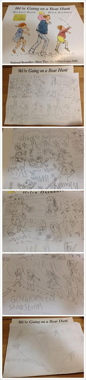 读了we are going on a bear hunt,我家娃做的picture walk, 画完还意犹未尽的做了presentation.