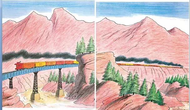 接下来,我们跟随凯蒂的脚步,一路上和它穿过山间,绕过村庄,爬过山崖,钻过隧道,经过田野,驶过平原。