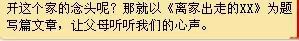2.爸爸妈妈有时会有不好的想法,如会认为好孩子都在别人家。可是,也许我们小朋友也会觉得自己父母不如别人的父母好呢?如爸爸不陪自己玩,妈妈太唠叨,那小朋友们碰到这种时候有没有产生离开这个家的念头呢?那就以《离家出走的XX》为题写篇文章,让父母听听我们的心声。